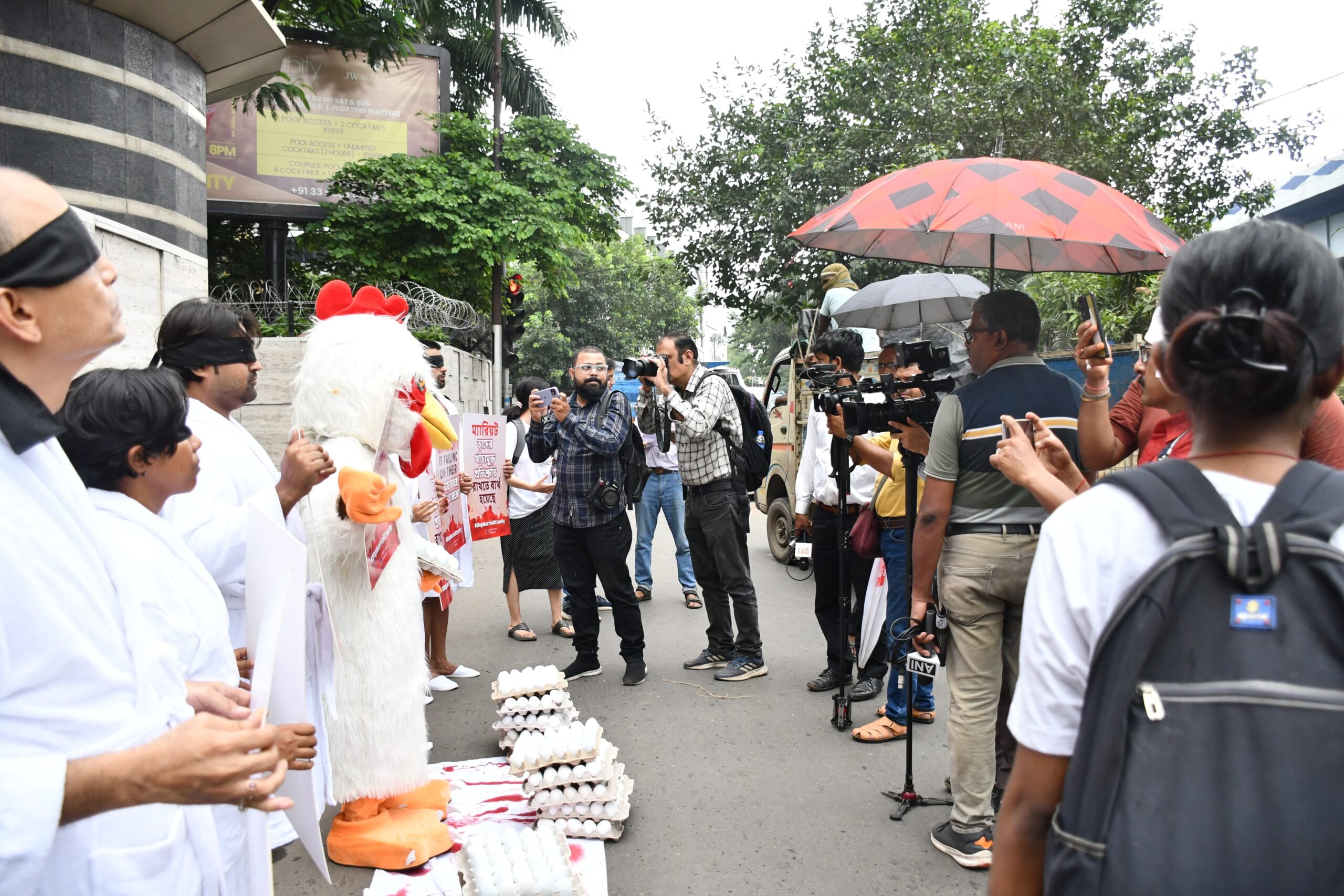 Outside the Kolkata Marriott, heads turned as “hotel guests” in bathrobes stood beside a giant “hen” and bloodstained egg crates. The striking scene wasn’t performance art; it was a powerful protest demanding that Marriott International keep their cage-free egg promise.