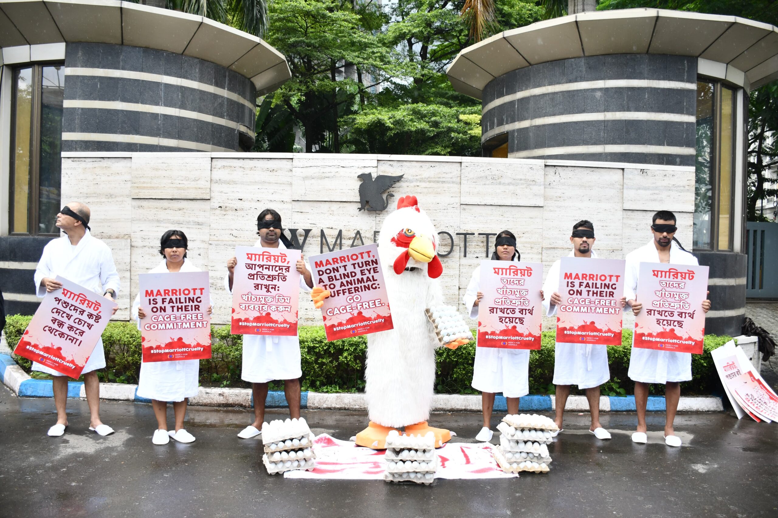 [PHOTOS] Mercy For Animals Activists in Bathrobes Expose Marriott’s Broken Cage-Free Promise in Chandigarh